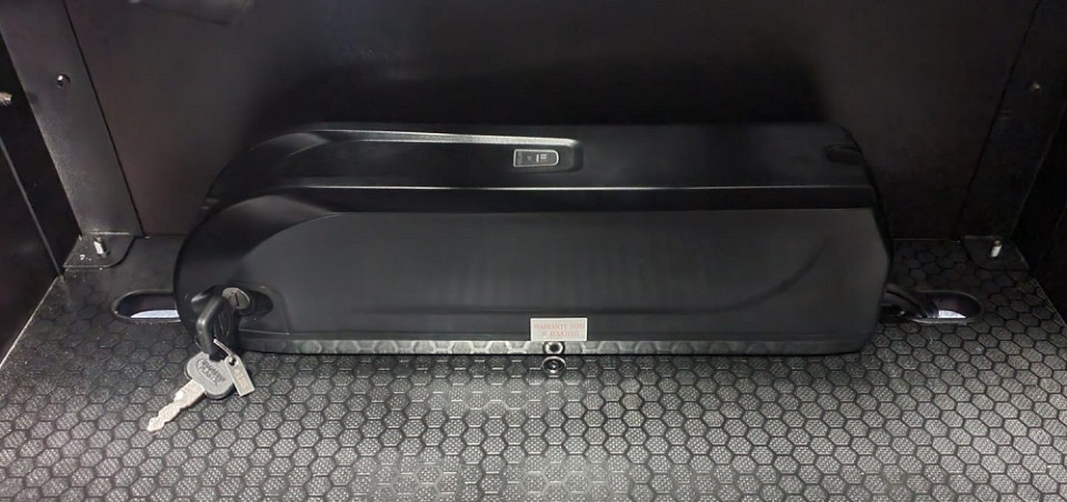 De accu is veilig en uit het zicht geplaatst onder het bankje in de bak. Dit beschermt de kostbare techniek tegen regen en hondenpoten. Opladen kan eenvoudig door de accu uit de bak te nemen, of direct via de handige laadpoort aan de zijkant van de bak terwijl de accu gewoon blijft zitten.