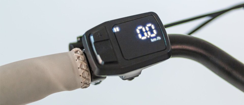 In het midden van het stuur vindt u het Ananda LCD-display. Hierop leest u in één oogopslag uw snelheid, de afgelegde afstand en het exacte accupercentage af. De bediening zit direct naast uw handvat, zodat u uw handen altijd veilig aan het stuur kunt houden terwijl u tussen de ondersteuningsstanden schakelt.