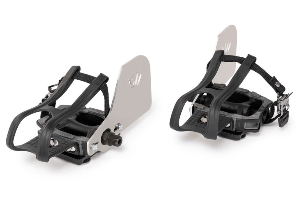 De kunststofkooi voorkomt dat de voet naar voren glijdt. De laterale geleiders voorkomen tegelijk dat de voet naar binnen draait. Het contragewicht zet de pedalen altijd in de horizontale stand, zodat de bestuurder er zonder problemen zijn of haar voeten kan insteken.