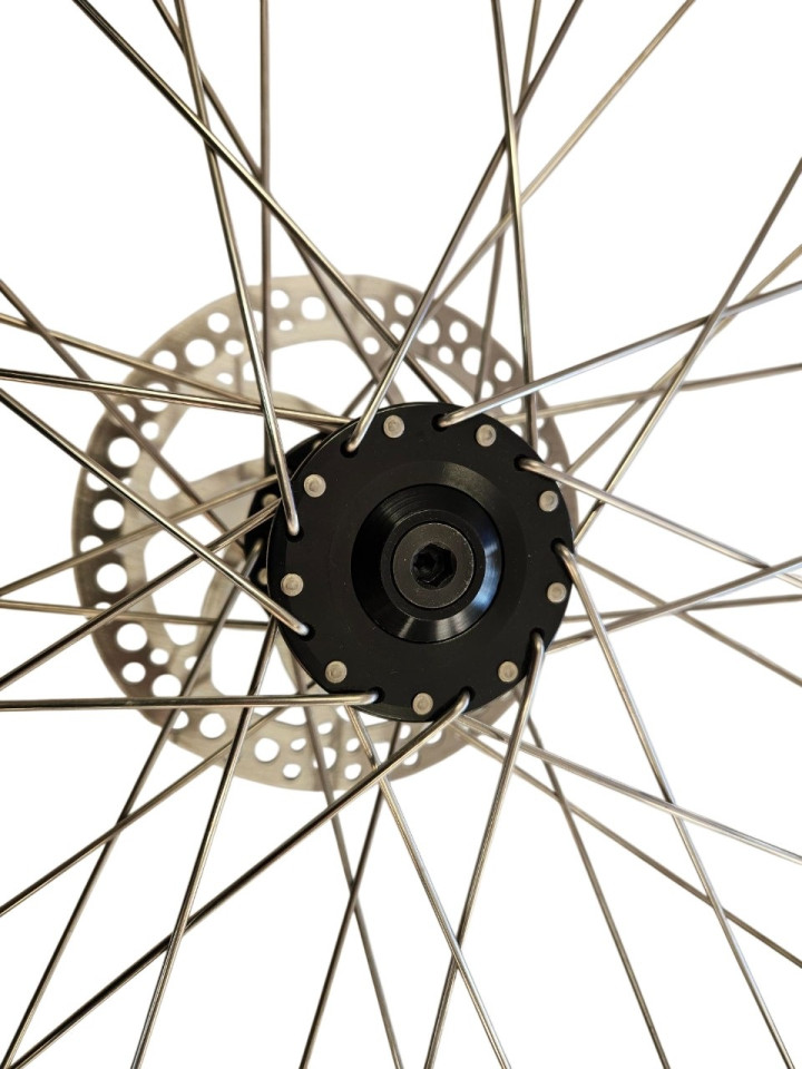 Dit complete 24 inch voorwiel linker zijde (ETRTO 507) is speciaal ontworpen voor de zware belasting van een bakfiets.